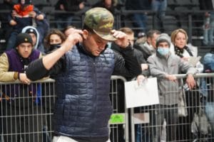 11 – Flo sous le casque, TikToker professionnel, qui croit encore qu’avec son bracelet bleu « pass sanitaire », ses accès sont illimités dans La Défense Arena.