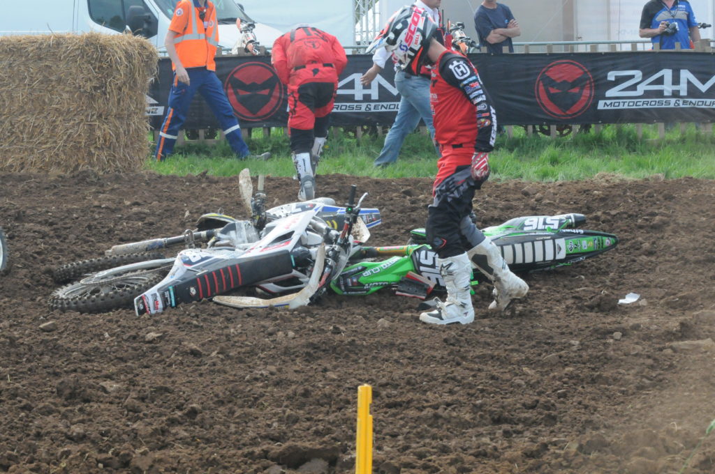 Les manches se suivent et ne se ressemblent pas pour Pierre goupillon 720 et Tom Vialle, victimes d’une énorme chute collective au départ avec huit pilotes au sol. Vialle ne pourra pas repartir à cause d’un radiateur percé. Goupillon, quant à lui, rentre au parc pour redresser sa fourche complètement vrillée. Devant c’est Brian moreau #225 qui se retrouve en tête, ce qui redonne le sourire au Team Bud Racing. Stephen Rubini #118, après un mauvais départ mais sans chute, remonte comme une balle au travers du pack en étant clairement plus rapide.
